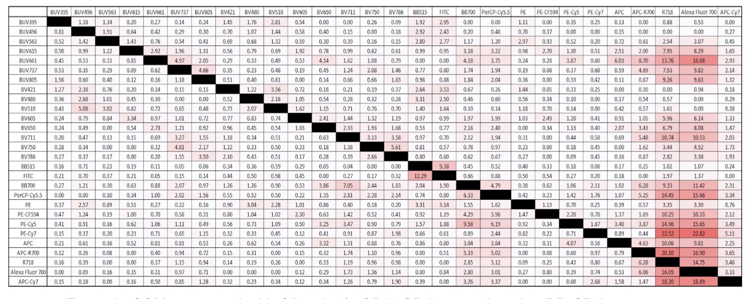 If you do not evaluate spread in your panel, your data can be flawed since the presence of spread impacts your ability for population resolution. You can empirically predict spread by creating a spillover spread matrix (SSM), first reported here. Not only will a SSM expose potential incompatible fluorophores and spread within your flow panel but it can also show how the panel will act instrument to instrument, which is useful for standardizing instruments with the same panel. A SSM can be made by staining well-expressed markers like CD4 in each fluorophore in your panel. The spillover spread value correlates with the amount of spread between fluors, and is interpreted as a heat map. Areas highlighted in darker red show where spread is relatively high in your panel.