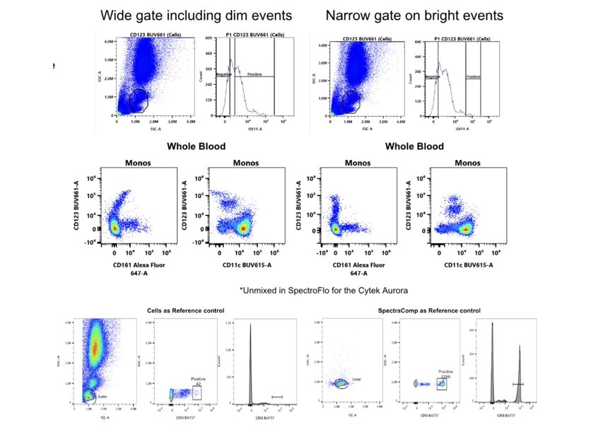 The last rule is that your single stained control should be as bright or brighter than your multicolor sample and as a subrule to this you also need to collect enough events to provide accurate data for the algorithms. This rule often applies to cells which can have different levels of brightness for a given fluor. If you gate on the dimmer population rather than the brightest it can result in compensation or unmixing errors. Adding onto this, too few events can lead to calculation errors in the compensation or unmixing software as well as making it difficult to accurately gate the populations (see example below).