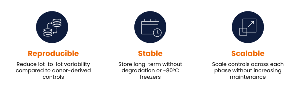 Unfortunately, commonly used controls like engineered cell lines or donor-derived blood cells introduce variability and operational challenges, which compound an already complex ecosystem instead of helping to manage it. The lack of consistent assay benchmarks can create roadblocks across the entire development pipeline—from discovery to clinical trials, to commercial production after market approval.